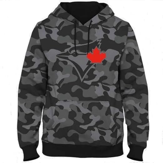 Stay warm and show your team pride with this Bulletin MLB Toronto Blue Jays Camo Hoodie. Featuring a bold screen-printed logo over a modern black and grey camouflage pattern, this fleece-lined pullover delivers everyday comfort with standout style. Perfect for game days, streetwear, and layering through the cooler seasons.