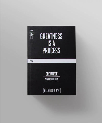 • “GREATNESS IS A PROCESS” woven label on bottom right seam