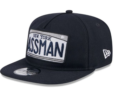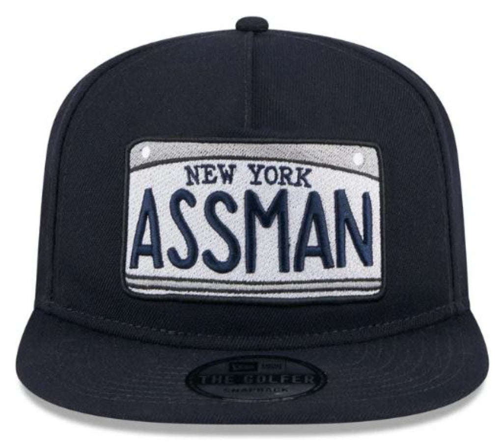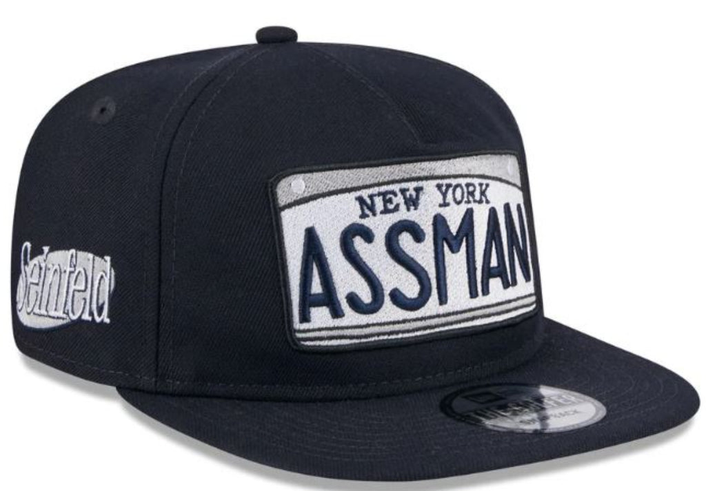 The Seinfeld Golfer Snapback features an embroidered Assman license plate at the front panels with a matching show logo at the right-wear side, a gray undervisor, and a snapback closure at the rear.