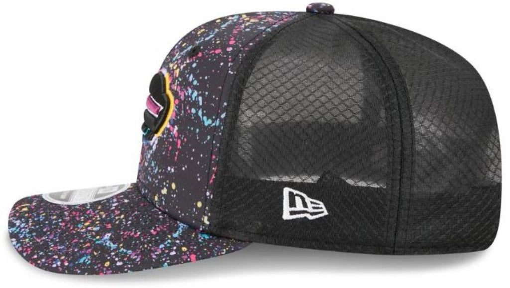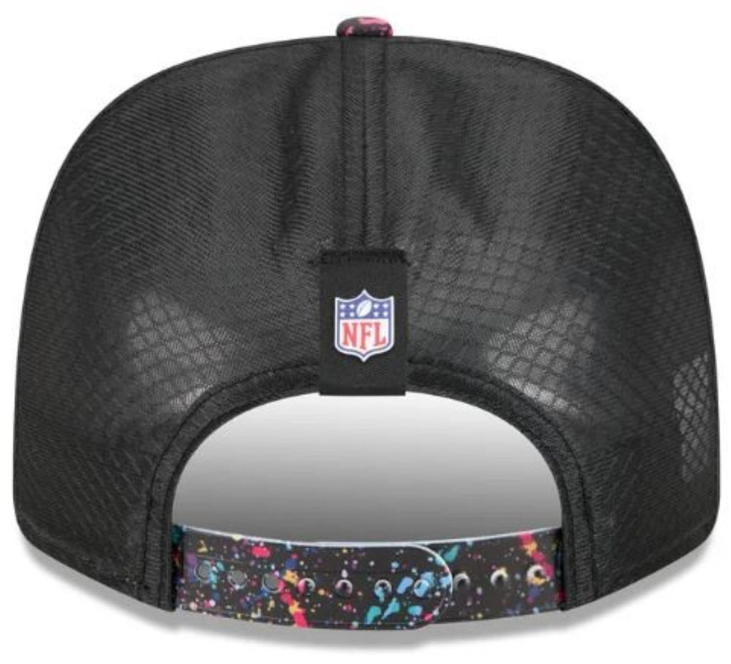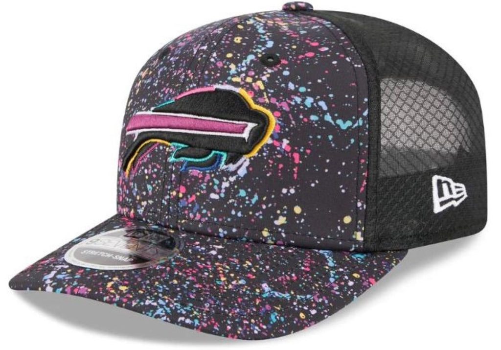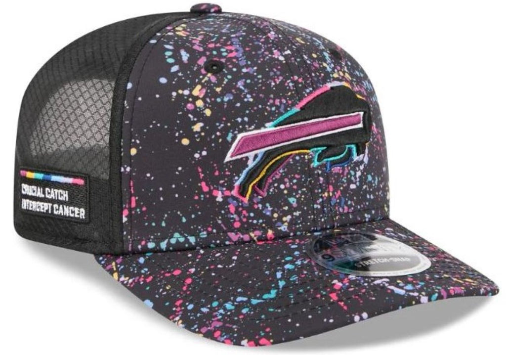 The Buffalo Bills 2025 Crucial Catch 9SEVENTY Trucker features an embroidered Lions logo at the front paint splatter panels with a woven NFL Shield tag above a snapback closure at the rear. Additional details include a Crucial Catch Intercept Cancer patch at the right-wear side with performance mesh rear panels and a black undervisor.